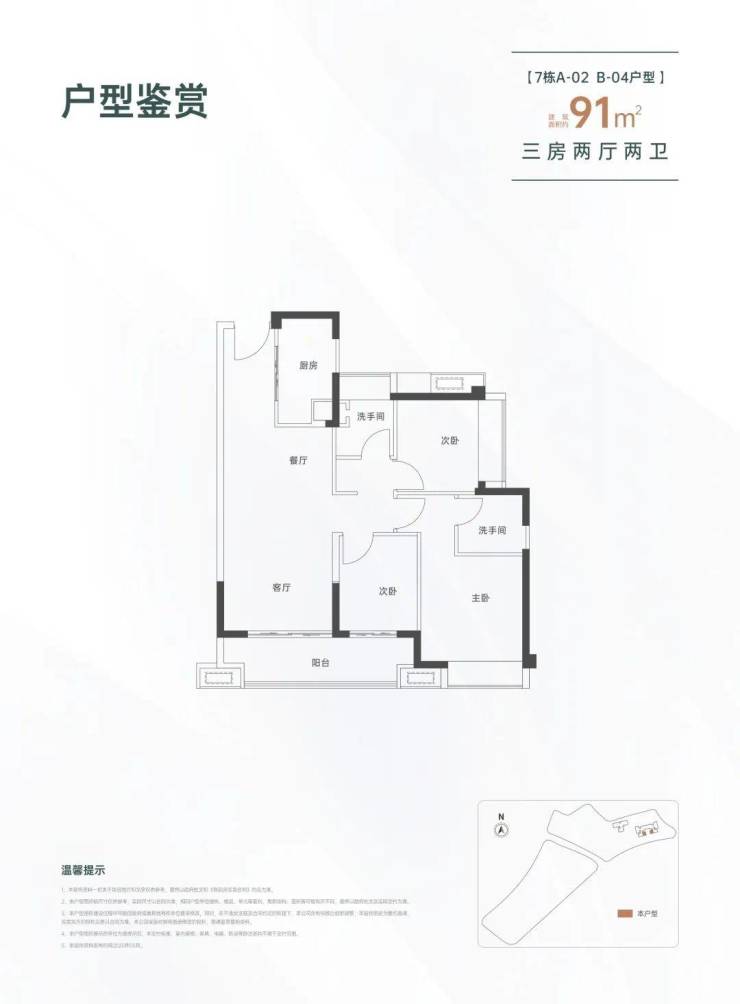 91㎡的3房2厅2卫,设计的是经典竖厅格局,进门入户玄关,LDKB一体化设计,三开间朝南,动静分区,客厅连接次卧出大阳台,L型厨房,公卫三段式分离,得房率约82%(不含赠送),东南朝向。