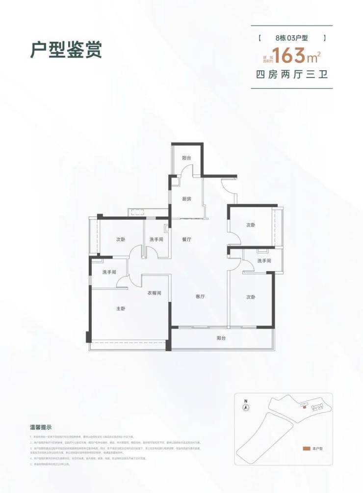 163㎡的4房2厅3卫,设计的是竖厅格局,一梯一户,进门入户玄关,LDKB一体化设计,三开间朝南,双主卧套房,客厅连接次卧出大阳台,L型厨房还带1个生活阳台,卫生间干湿分离,得房率约82%(不含赠送),东南朝向。