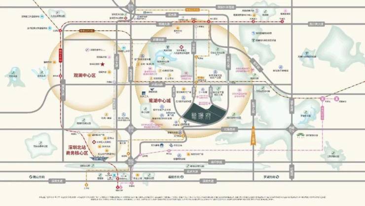 鹏瑞鹭璟府,位于龙华区观湖街道五和大道与澜清一路交汇处,地处鹭湖新城核心板块,紧邻观澜高新园区。该片区被定位为“科技行政文化核”,与深圳北站商务区共同构成龙华区“双核中心”,是龙华区打造“数字龙华,都市核心”的重要载体。