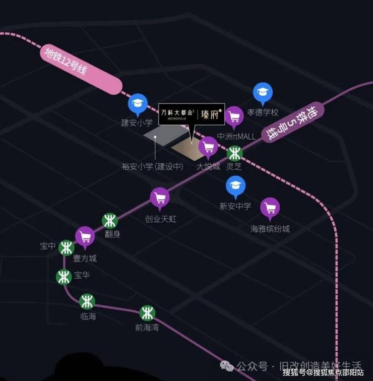 地铁5号线/12号线,交汇灵芝站,地铁2站宝中,5站前海湾站,多维一体;创业二路主干道通达,纵贯宝安黄金发展轴心
