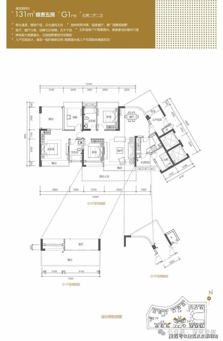 131㎡的5房2厅2卫,设计的是竖厅南北通透格局,客厅4.25米开间,客餐厅分离设计,主卧连接270°观景露台,带大入户花园设计,还有观景露台。