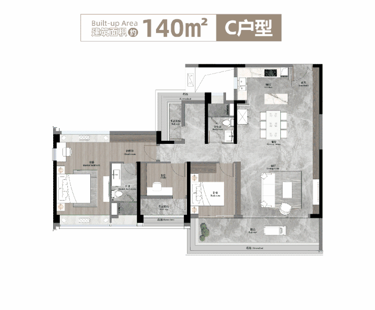 建面约140㎡C户型。从整体空间尺度的打造,到舒适度的用心,这个户型,不仅是过往和樾府同面积户型的迭代进阶,更算得上广州改善户型的新高度。