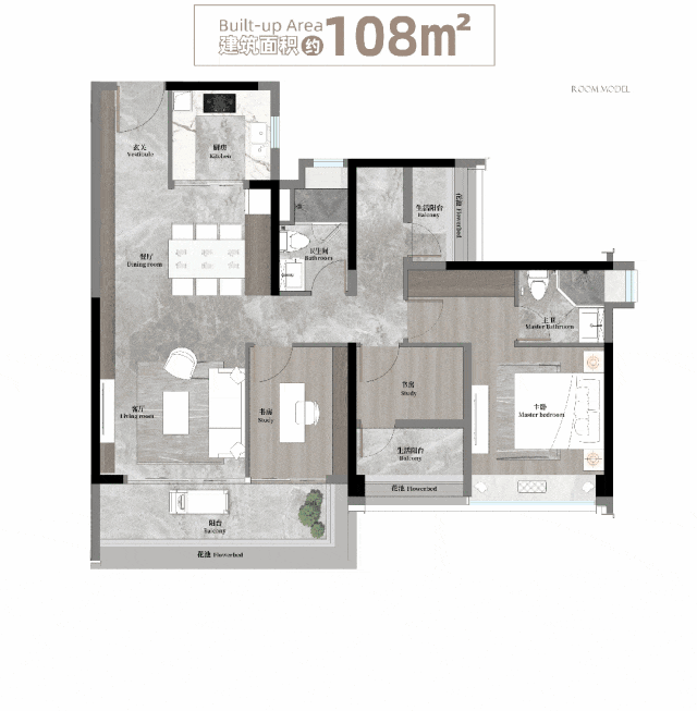 建面约108㎡户型,堪称天河改善的“性价比王者”。在其它项目大多只能做三房的面积段,该户型能实现四开间南向采光,多个房间都能有充足的光照。即便是多孩家庭,一家人也都能拥有阔绰、舒适的居住体验,而不觉得逼仄。