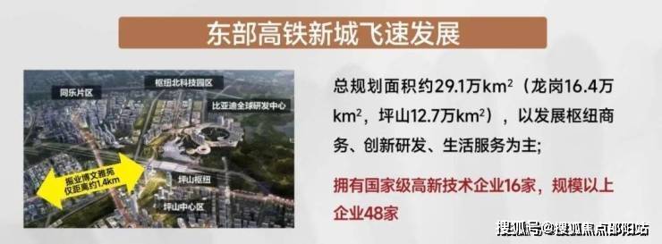 以坪山高铁站为中心发展枢纽商务、创新研发、生活服务。总规划面积约29.1万k㎡,其中龙岗16.4万k㎡,坪山12.7万k㎡。拥有国家级高新技术企业16家,规模以上企业48家。