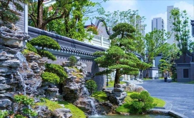 这五条巷道是串联起整个墅区的脉络, 漫步其中,脚下是整石雕刻的地铺,身侧是青翠古美的罗汉松、缓缓流淌的水流,凝结了一副“明月松间照,清泉石上流”东方意境。