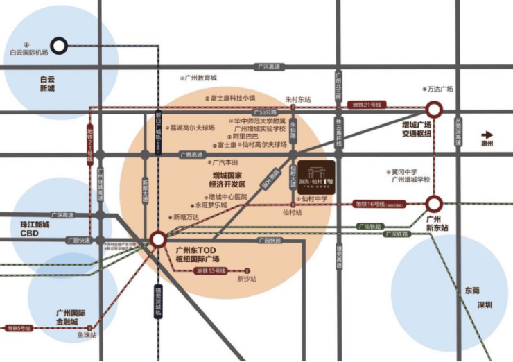 项目位处广州东TOD枢纽国际广场及广州新东站的中心,地铁16号线(仙村站在旁)连通两大交通枢纽,周边6高速环绕(广惠、广园、广深、北三环、增莞、花莞),40分钟直达天河。