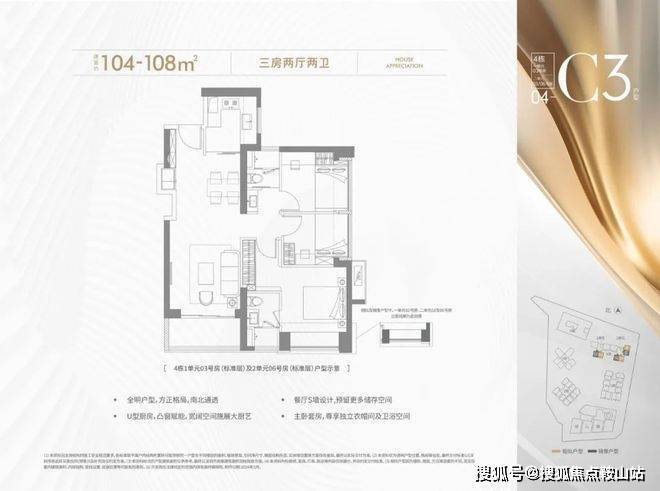 104-108㎡的4房2厅2卫,设计的是竖厅格局,进门入户玄关,客厅3.6米开间,LDKB一体化设计,进深8.7米,S墙设计预留冰箱卡槽位,三开间朝南,主卧套房设计,U型厨房,公卫三段式分离,得房率约72.45%(不含赠送),正南或正东朝向。