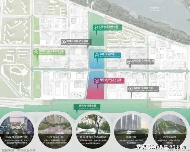 三条重要街道连接五大分区,分别是:深湾公园路—艺文大街、白石四道—总部景观大道、海旁街—滨海步行街。
