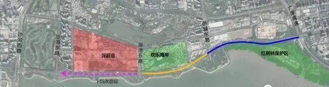 滨海大道(总部基地段)交通综合改造工程西起沙河东路,东至广深高速滨海立交。改造路段全长约6公里,全线按主路双8+辅路双6进行改造,其中下沉隧道长约1.2公里,下沉隧道与高强度开发地区交通组织衔接形式采取多点进出,主、辅路均原位下沉,主线平铺浅埋,辅路竖向分层
