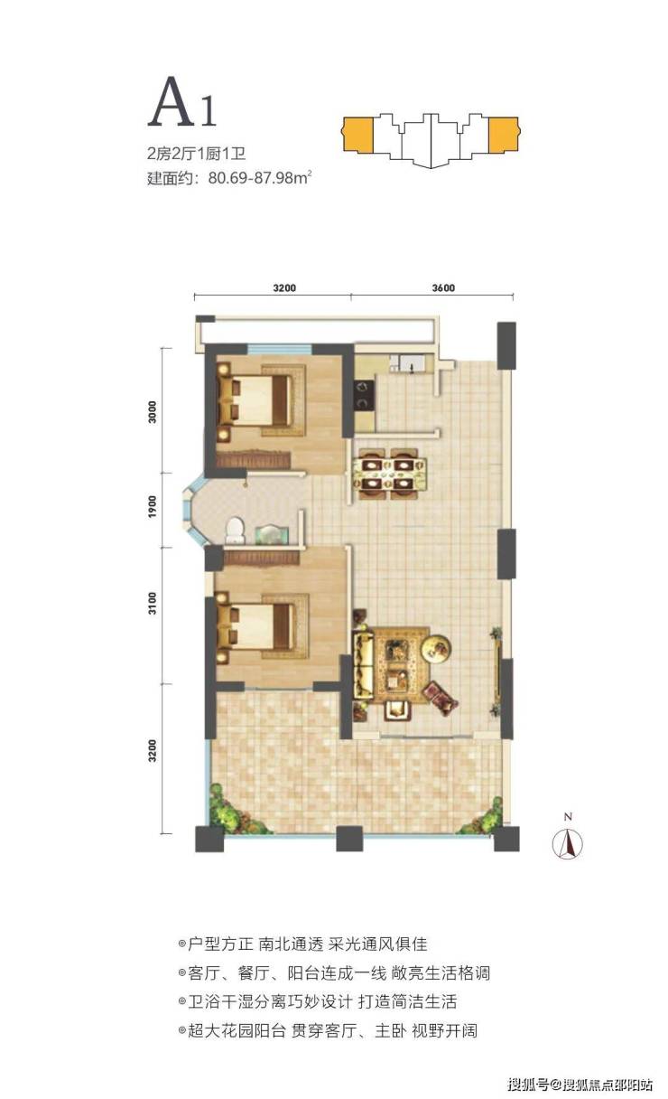 在售户型面积80-88㎡两房,户型方正,南北通透。