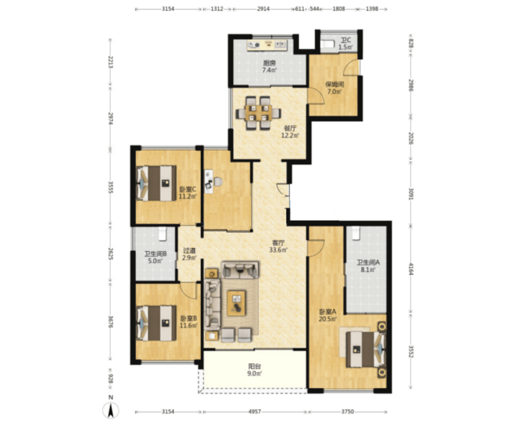 (△240㎡四房两厅三卫+工人房套间)