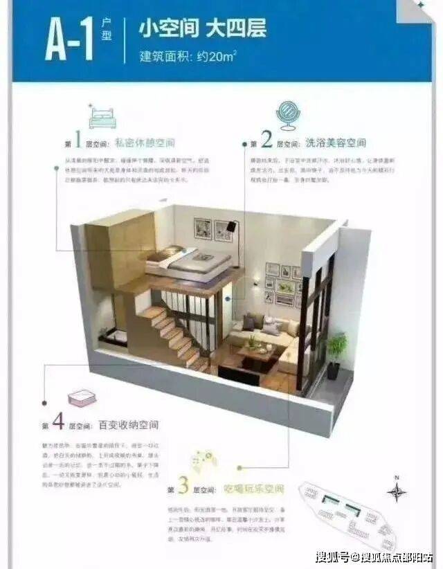 A-1户型品鉴:3.6米层高,单面采光,上下分层布局合理,收纳、起居、空间相对独立。较高的采光高度,足以满足室内自然光线的明亮,小阳台也可完全满足日常外界接触空间和晾晒的需求。