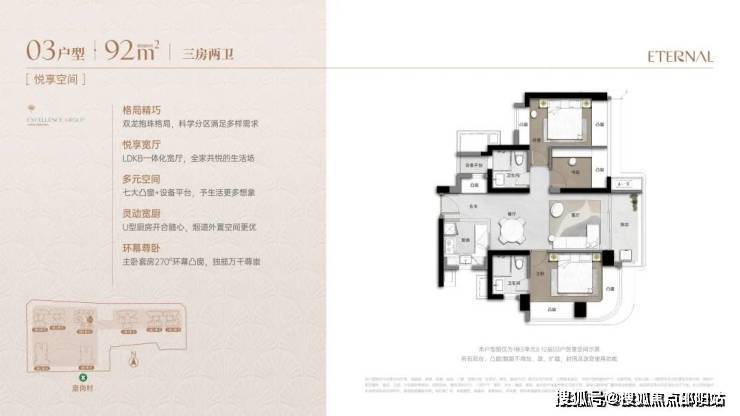 高使用率:新规设计下,销售使用率超90%(传统项目约75%-85%),通过弹性方厅(可变空间)、多飘窗+设备平台等设计提升实际可利用面积。