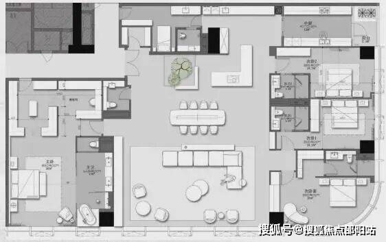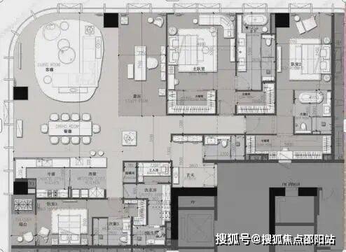 户型鉴赏• A户型:约396㎡的3+1房2厅2厨5卫,由llsd亲笔操刀设计,270°的城市景观、全套房和双主卧设计,约9.9米的超宽客餐厅开间,主卧方正且面积达24㎡,明卫设计,次卧带阳台,中西厨结合,还有灵活多变的多功能房。
