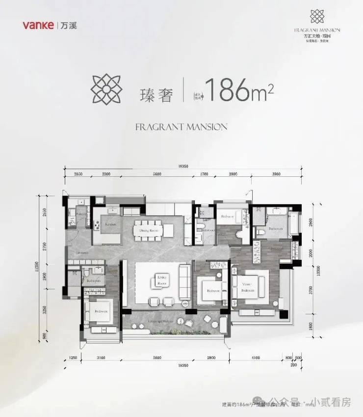 建面约 186m² 4 房 + 2 厅 3 卫 + 灵动空间,正南向 01、02 户型一线花地湾河涌景观视野,全明四开间朝南,约 18.3 米极致奢幕视野,LDKB 洄游路线,多功能巨幕宽厅,多功能岛台,端厅套房主卧