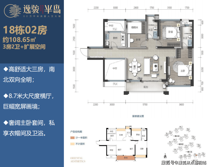 逸骏半岛以珠海人居 特征为源点,设计了 两梯四户、户户南北 向蝶式建筑,完美兼 顾实用、隐私与采光 通风。全新二期10、 18栋,在108-131㎡ 传统三四房面积段中, 创造性拓展出大四五 房空间,让奢享级安 家也能轻松拥有。