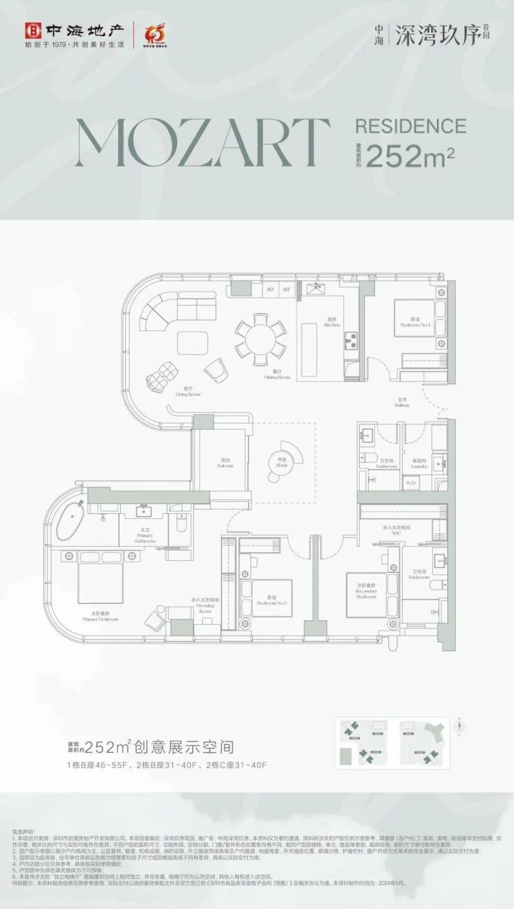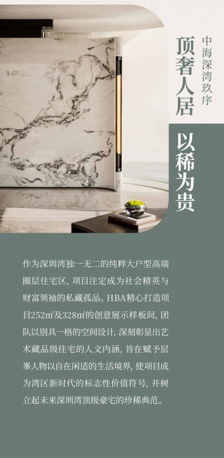 中海·深湾玖序户型设计独特,打造奢阔居住空间。主力户型196 - 328平方米,空间精心雕琢。另规划少量400 - 600平方米顶层复式,融合平层开阔与复式灵动,顶层位置视野开阔,私密属性强,满足高端圈层极致与个性化居住需求。
