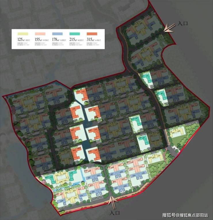 在这样的规划下,住宅类项目就不可能密集且多了,根据项目资料,住宅推出125㎡、155㎡、178㎡、215㎡、315㎡这5种面积段的合院别墅,由下图可以看到各面积段别墅的布局位置。