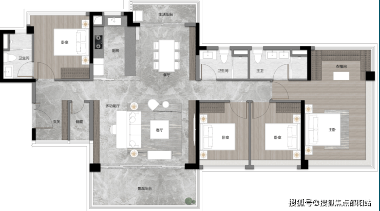 建面约123平四房,卧室都可放下1.8米大床,体验感相当于144平大宅,品质感更高。