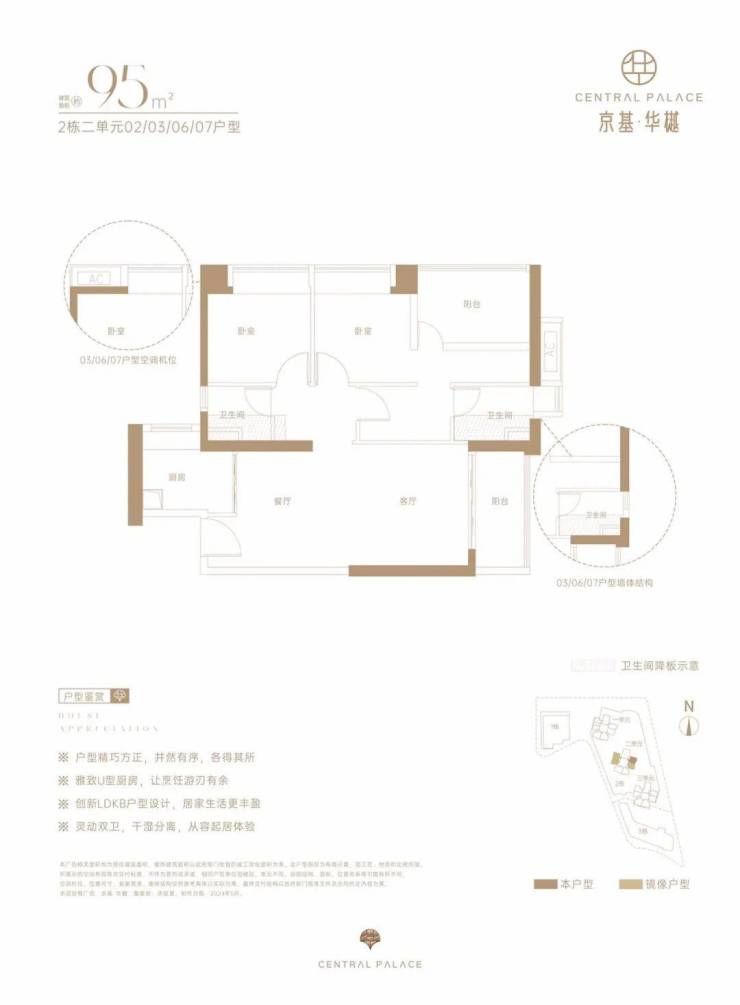 仅2栋2单元05户型才有,设计的是经典竖厅格局,LDKB一体化,动静分区,四开间朝南,U型厨房,卫生间干湿分离,得房率约73%(不含赠送),阳台西南朝向。