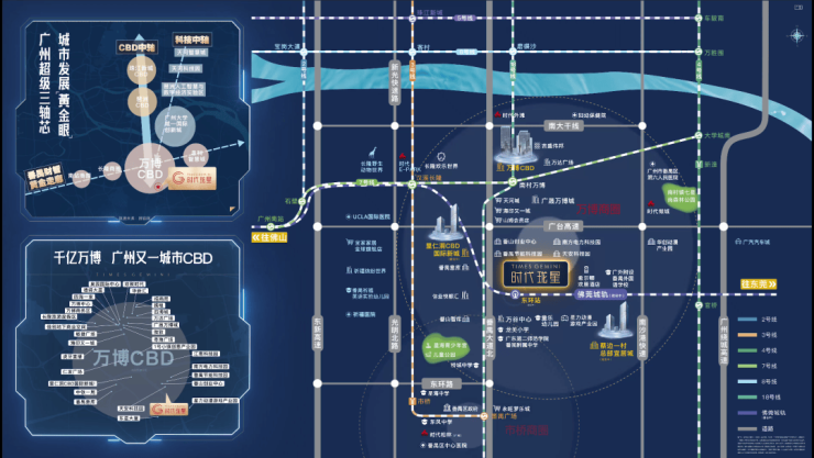 万博CBD在区位上位于番禺华南板块核心地段,北承珠江新城、琶洲会展中心、南接南沙自贸区,西连广州南站,占踞广州CBD中轴,广深港澳科技走廊与广深港高铁经济带双廊交汇的黄金C位,又属广州南拓轴与珠三角东西岸融合带核心,未来CBD价值不言而喻,万博板块的时代珑星,距离万博3公里多。