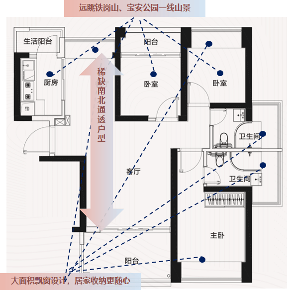 南北通:稀缺端头位,客厅、主卧东南、次卧西北,南北通透,采光、通风无忧