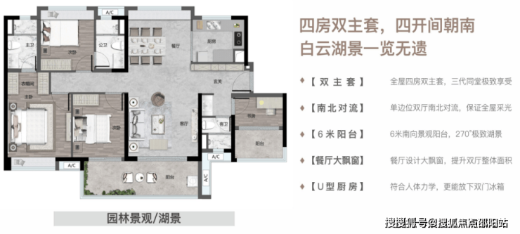 140平方米四房二厅二卫:四房双主套,6米大阳台,望湖极致景观面。