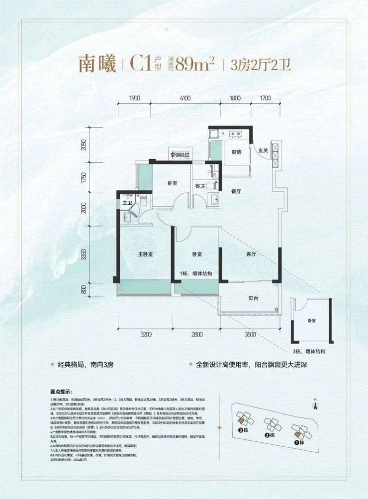 89㎡的3房2厅2卫(C1户型),设计的是经典竖厅格局,进门入户玄关,客厅3.5米开间,S墙设计预留冰箱卡槽位,三开间朝南,3个卧室分别做到了3.2米/2.8米/2.35米的宽度,U型厨房,卫生间干湿分离,得房率约:81.39%(不含赠送),西南朝向。