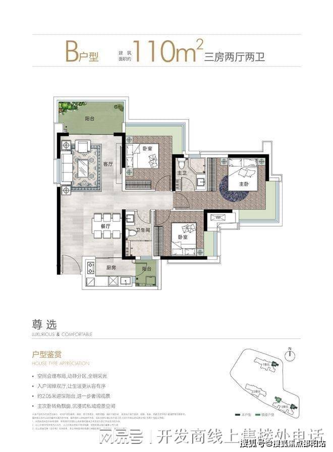 110㎡三房两厅两卫:同样是竖厅格局,LDKB 一体化设计,动静分区。客厅开间 3.9 米,配有独立玄关。三个卧室分别为主卧 16㎡、次卧 12.3㎡、次卧 9.56㎡,L 型厨房带小生活阳台,卫生间干湿分离,得房率约 79.24%,有西南和东北朝向两种可选。