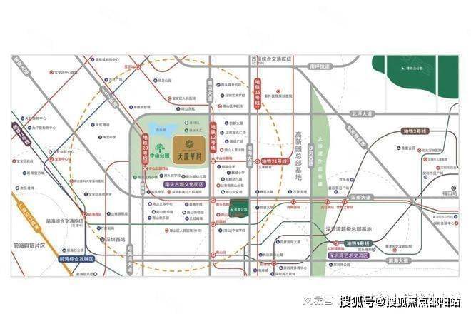 交通配套:项目距离地铁 12 号线 “中山公园站” 咫尺之遥,规划中的 21 号线未来也将在此设站并与 12 号线交汇。此外,项目东侧是南山大道,北面是北环大道,自驾去往前海、深圳湾、宝安等地较为便捷。周边直线 1km 内有 24 个公交站,距离最近的中山公园东门站仅有 259m。