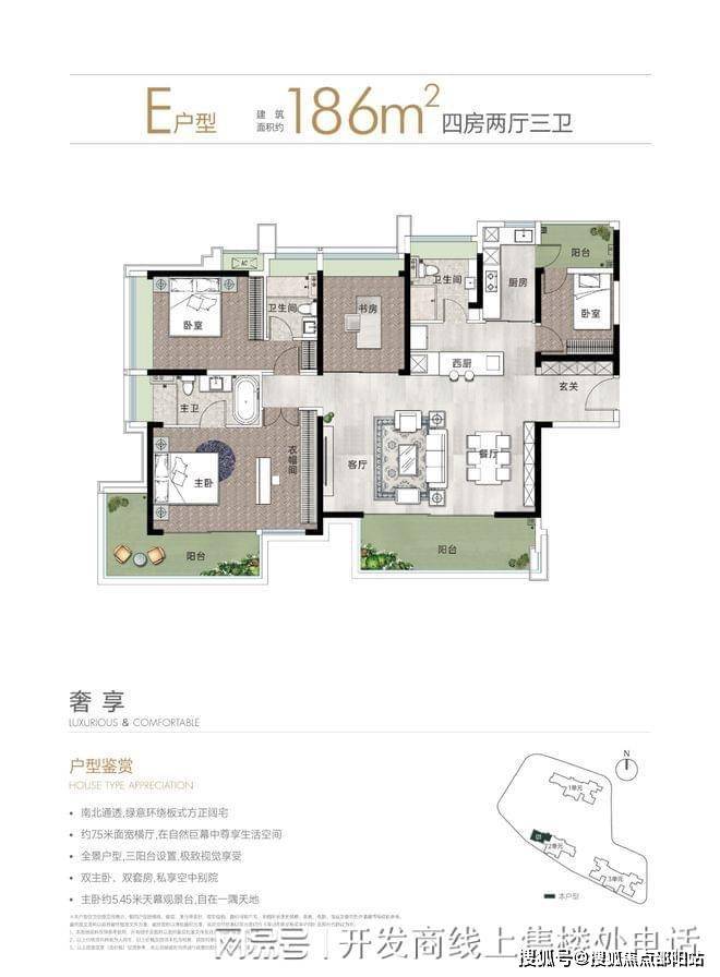 186㎡四房两厅三卫:横厅南北通透格局,板楼设计,客餐厅 7.5 米开间,空间尺度大。双主卧、双套房设计,私享空中别院,主卧约 5.45 米天幕观景台,可将中山公园美景尽收眼底。全景户型,三阳台设置,极致视觉享受,适合对居住品质有较高要求的改善型客户。