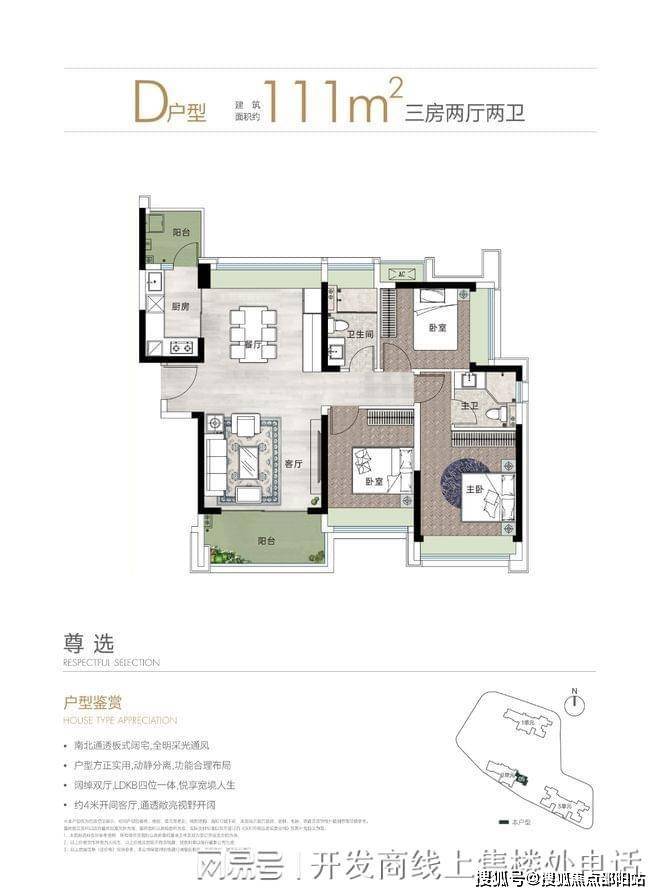 111㎡三房两厅两卫:竖厅南北通透格局,板楼设计,客厅 4 米开间,三开间朝南,采光和通风极佳。三个卧室分别为主卧 13.88㎡、次卧 11.1㎡、次卧 9.99㎡,L 型厨房带小生活阳台,卫生间干湿分离,得房率约 78.83%,西南朝向。