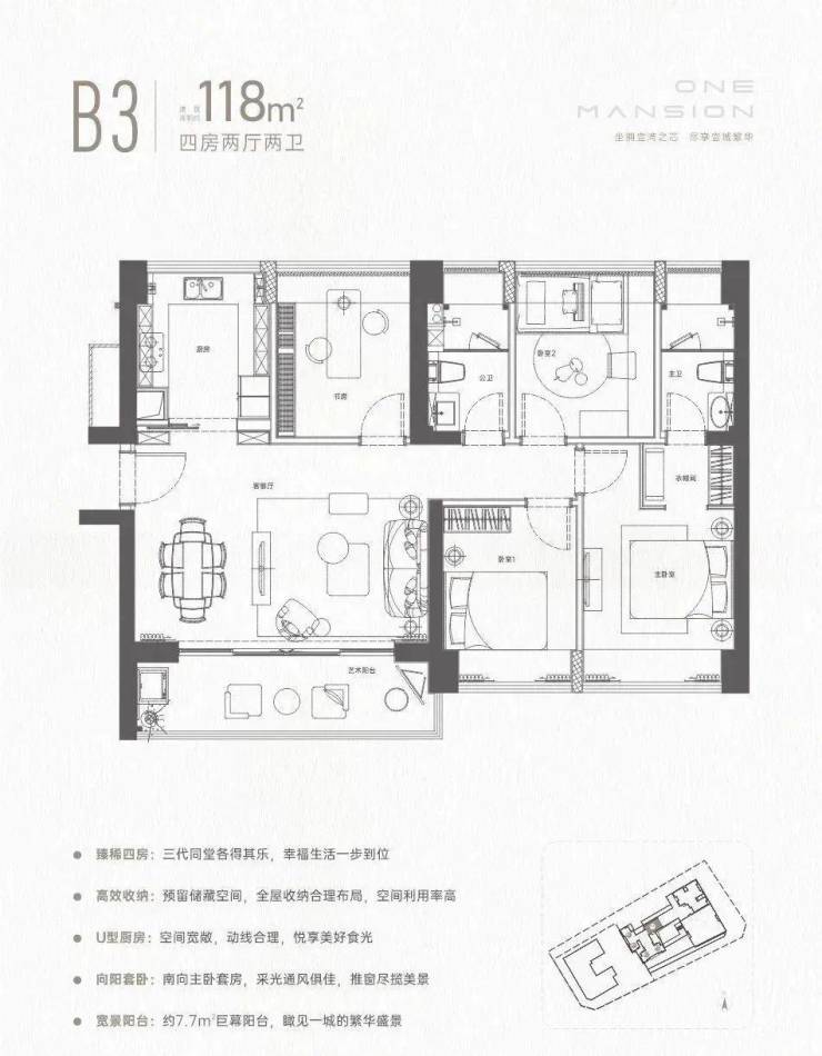 设计的横厅南北通透格局,客餐厅4.2米开间,全屋飘窗设计,四开间朝南,4个卧室分别做到了3.2米/2.9米/2.9米/2.7米的宽度,U型厨房,约7.7米长超大阳台,得房率72.47%(不含赠送),阳台主朝东南向。