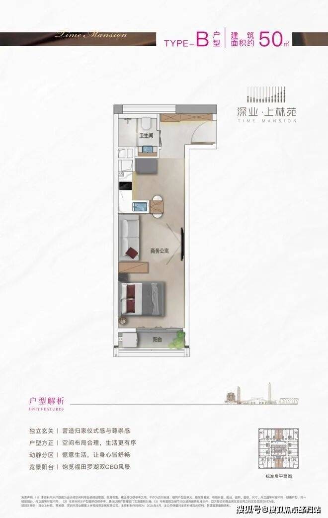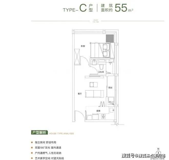 建面约55㎡的户型为一房一厅空间,格局方正。开放式的客餐厨的设计,让小户型避开了空间的拘束。另外,整体空间动静分离,让各个地方都分工明确。『公寓、办公双大堂,电梯均采用国际一线品牌静音高速电梯』