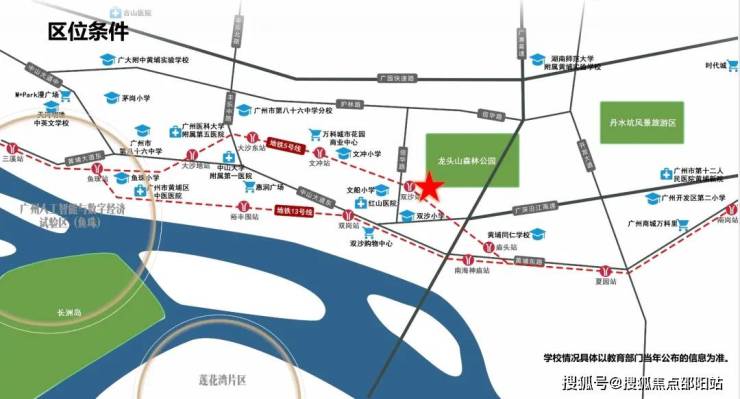 地块位于旧黄埔板块内,地铁五号线双沙站上盖,无需换乘即可到达广州各大CBD,西侧为龙头山森林公园。