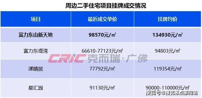 克而瑞监测到,周边断供多年,新房荒严重,周边二手次新项目挂牌均价基本超10万/㎡,其中富力东山新天地与本案仅一路之隔,为杨箕村旧改融资房,楼龄较高,贝壳成交数据显示,项目最近成交的二手房均价为98570元/㎡,其余挂牌均价高达134930元/㎡,置换改善需求明显。