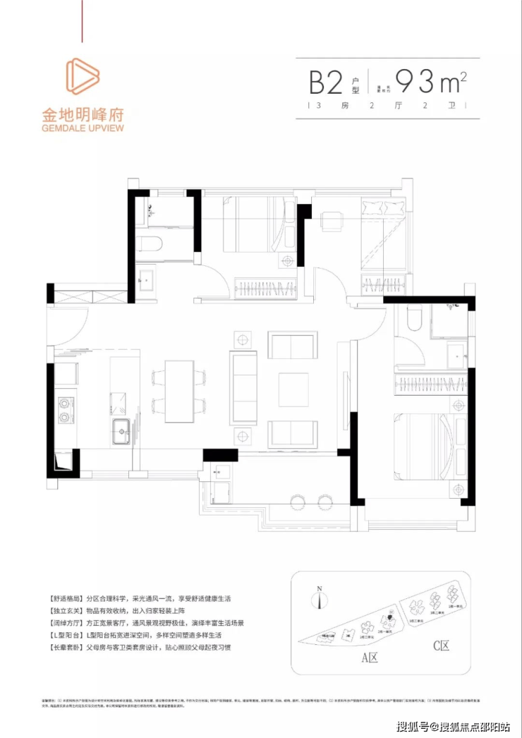 项目地块分A、B、C 3个区域,楼栋一字排开 朝向为东南、西南、西北。