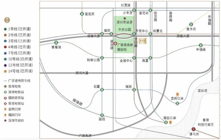 无缝接驳“五线换乘”岗厦北综合超级枢纽, 2公里内即达全国最大陆路口岸福田口岸及皇岗口岸