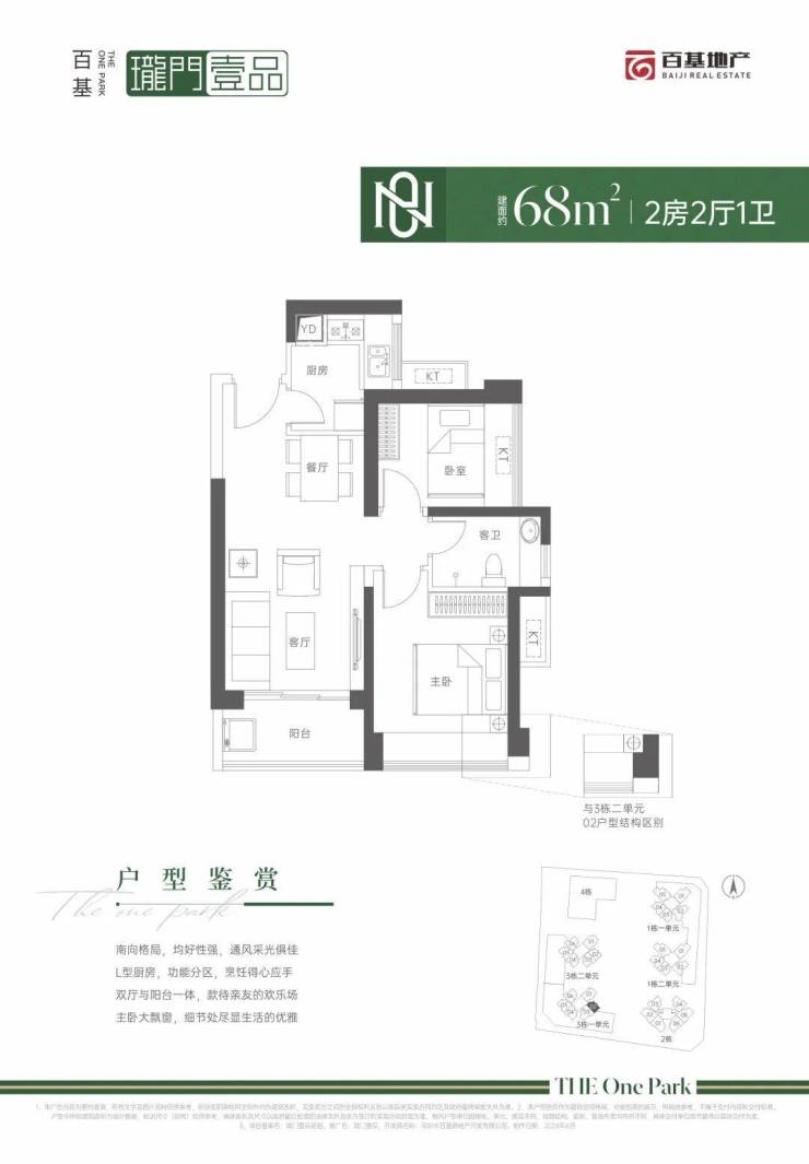 仅3栋1单元02户型,设计的是竖厅格局,客厅3.4米开间,LDKB一体化设计,L型厨房,卫生间干湿分离,东南朝向。