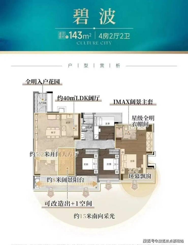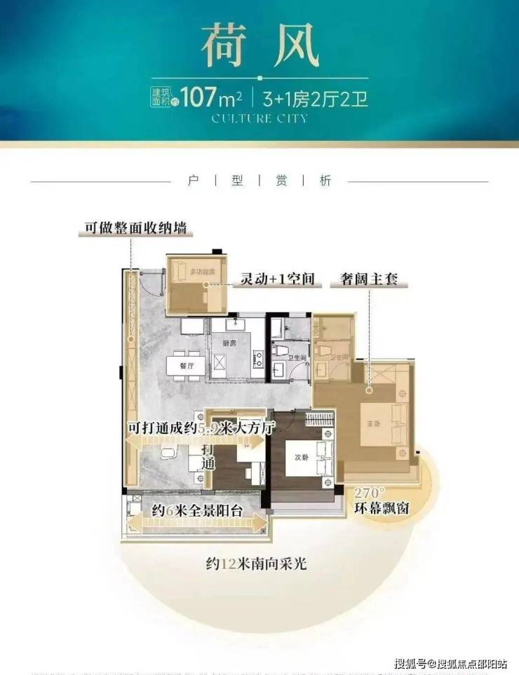 建面约107㎡的四房,拥有12米南向采光面,通透LDK一体化、约6米奢阔阳台,且带有独立入户花园。