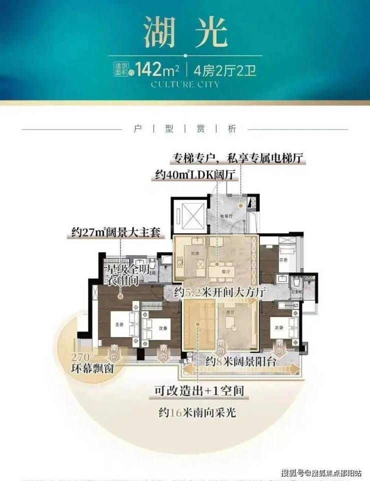 建面约142㎡的四房,做到约16米南向采光,站在约8米全景阳台,约1.2万㎡湖景扑面而来,高层还能望江。