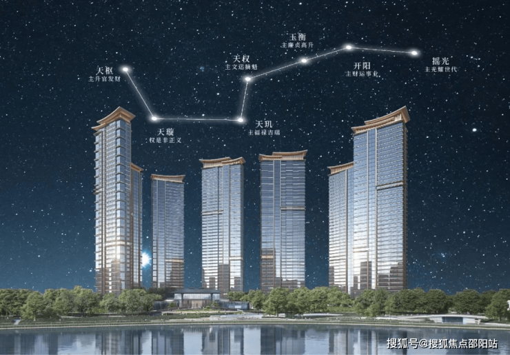 更特别的是,灯湖缦云7栋沿江楼栋,通过佛山未见一字列阵,连成“北斗七星”阵列,自西向东分别以天枢、天璇、天权、天玑、玉衡、开阳、瑶光命名,显赫尊崇气韵浑然天成。