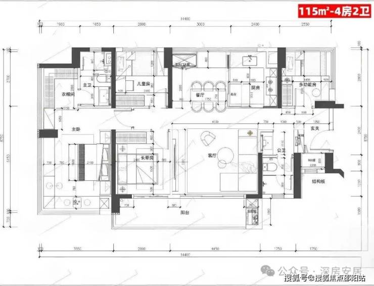 115㎡的4房2厅2卫,设计的是竖厅南北通透格局,进门入户玄关,客厅4.45米开间,餐客厅分离设计,客厅连接次卧出10.87m²的观景大阳台,L型中式+岛台灵动式厨房,公卫三段式干湿分离,得房率约78.27%(不含赠送),阳台主朝东南或西南向。靓点:南北对流+7.25米长超大观景南向阳台,超大主卧+270°无柱转角飘窗