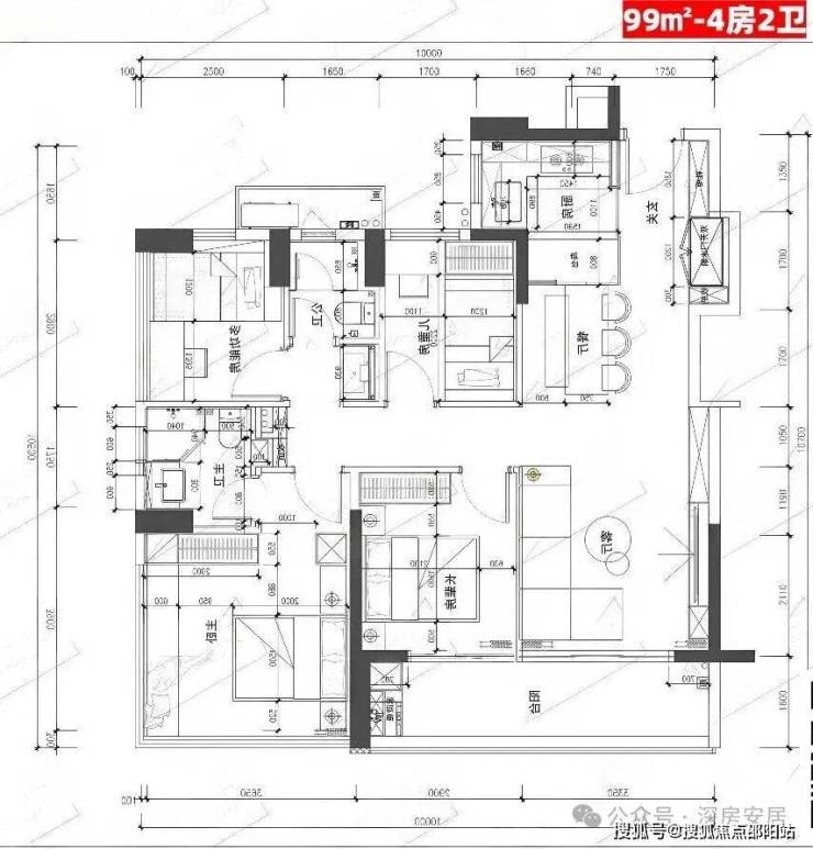 99㎡的4房2厅2卫,设计的是竖厅格局,客厅3.35米开间,LDKB一体化,S墙设计预留双开门冰箱卡槽位,三开间朝南,动静分区,U型厨房,公卫三段式干湿分离,赠送设备平台,得房率约78.27%(不含赠送),客厅连接次卧出9.37m²大阳台西南或东南朝向。靓点:99平做到了4房2卫,主卧270°无柱转角飘窗,厨房烟道外置+额外赠送设备平台,并且是纯南向格局。