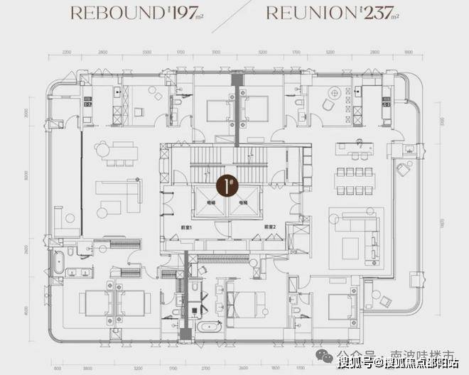 两个户型都是四房三卫+家政间设计,进门就是大客厅,卧室分布于客餐厅南北两侧,均拥有超大观景阳台。