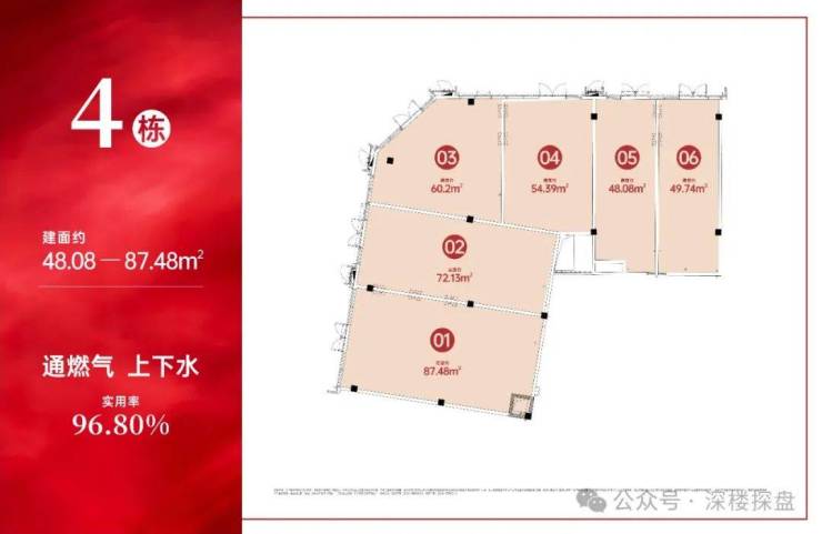 商铺使用率约96.8-97.7%、层高约5.4米,开间与进深比经过科学优化考量,格局方正、空间利用率高。