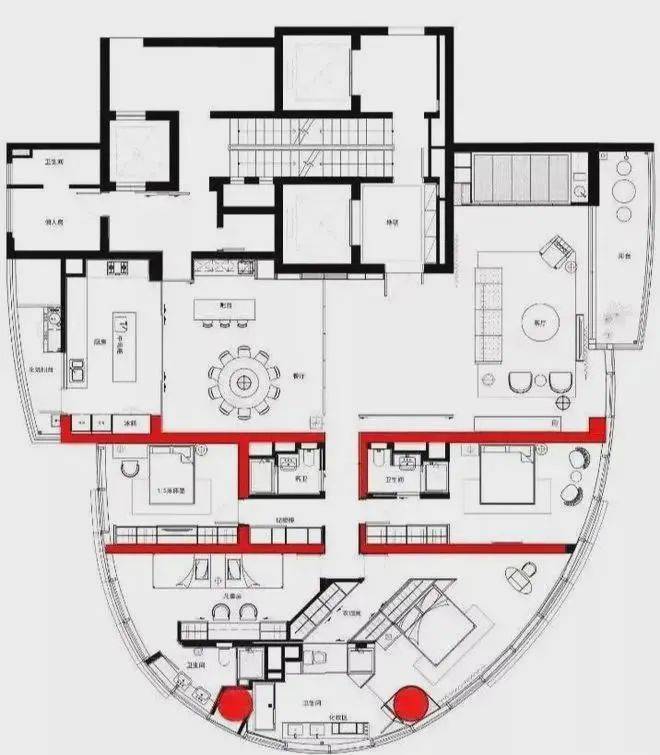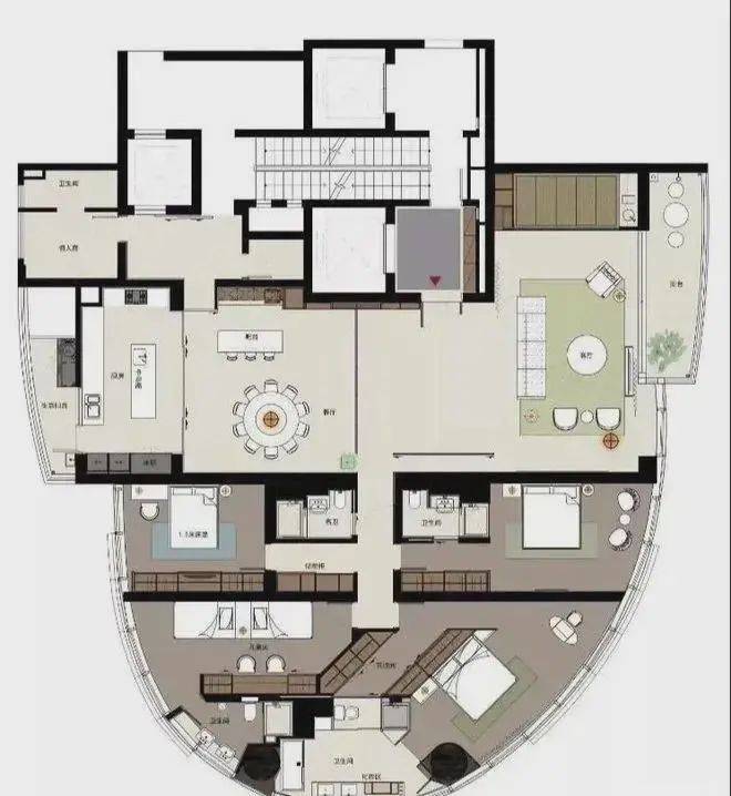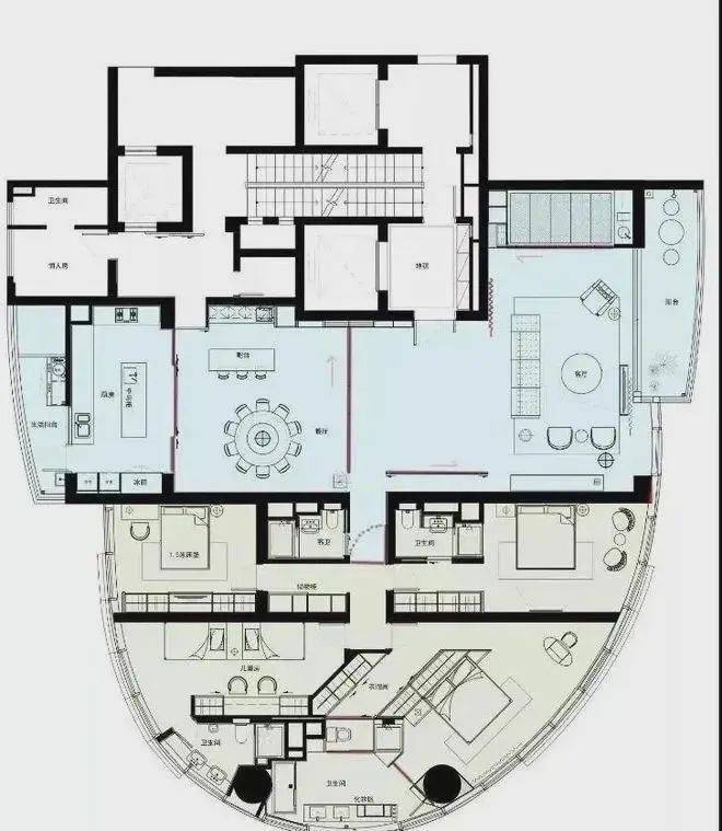 因为建筑本身结构关系。在空间布局上,我们更多的考虑到公共区域,主卧室及小孩房的布局