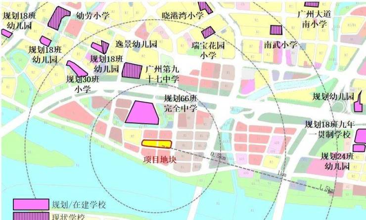 项目500米范围内规划有一所66班完全中学,1公里范围内有广州第九十七中学,1.5公里范围内有南武小学等。具体学区划分待进一步确认,但教育配套的优势已经显现。