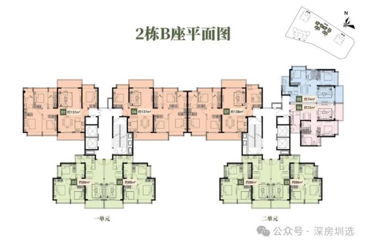 🔹2栋B座一单元01、04户型、2栋B座二单元01户型:面积约为137-138㎡的4房2厅2卫;