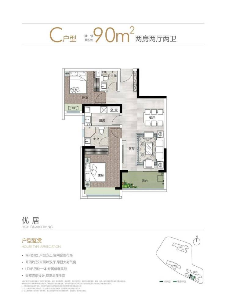 92㎡两房两卫,全南朝向,主卧带飘窗,总价门槛最低;但次卧仅8㎡且得房率低至73%,需后期改造。